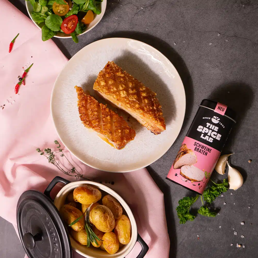 Zum Servieren kann der Schweinebraten mit einem frischen Salat oder kleinen Kartoffeln kombiniert werden, die mit unserem Pommes & Bratkartoffel Gewürzsalz gewürzt und im Air Fryer oder Ofen