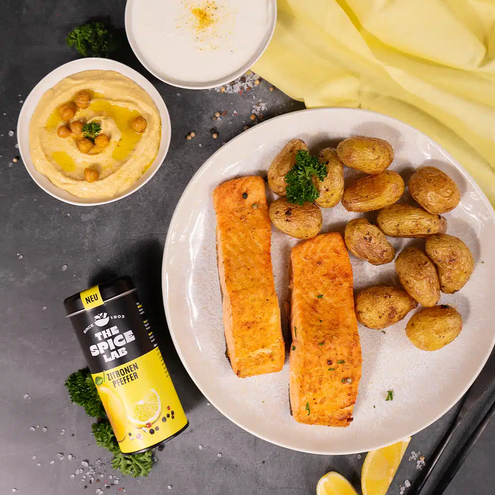 Die Lachsfilets mit etwas Öl bestreichen, mit 1 TL Zitronen Pfeffer marinieren und im Air Fryer bei 180 Grad garen.